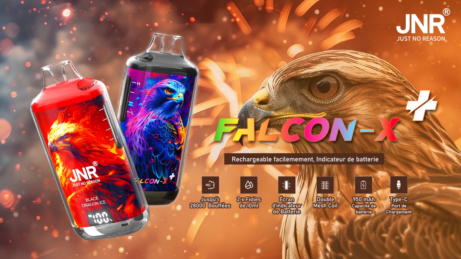 Compact, robuste et terriblement efficace, le JNR Falcon X Plus est l’outil ultime pour une vape premium, durable et sans contrainte. Prêt à changer de dimension ?